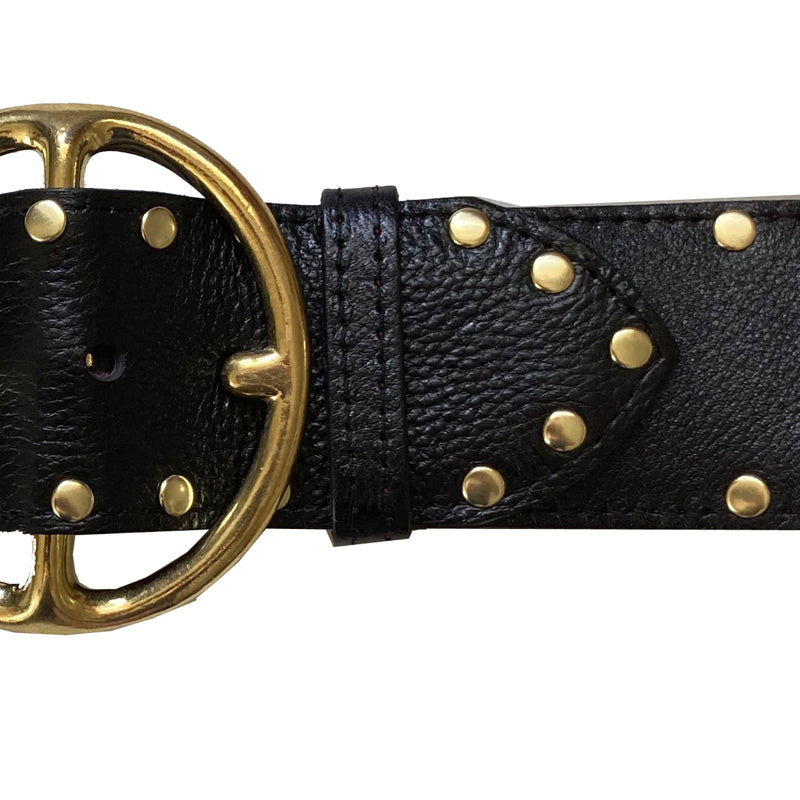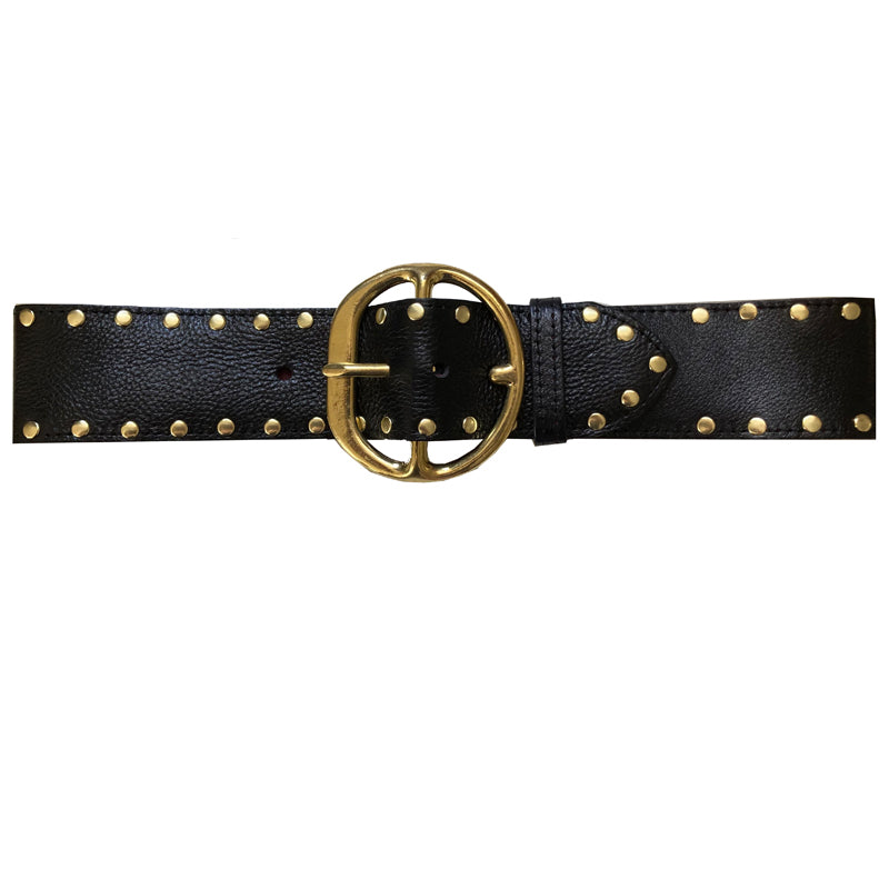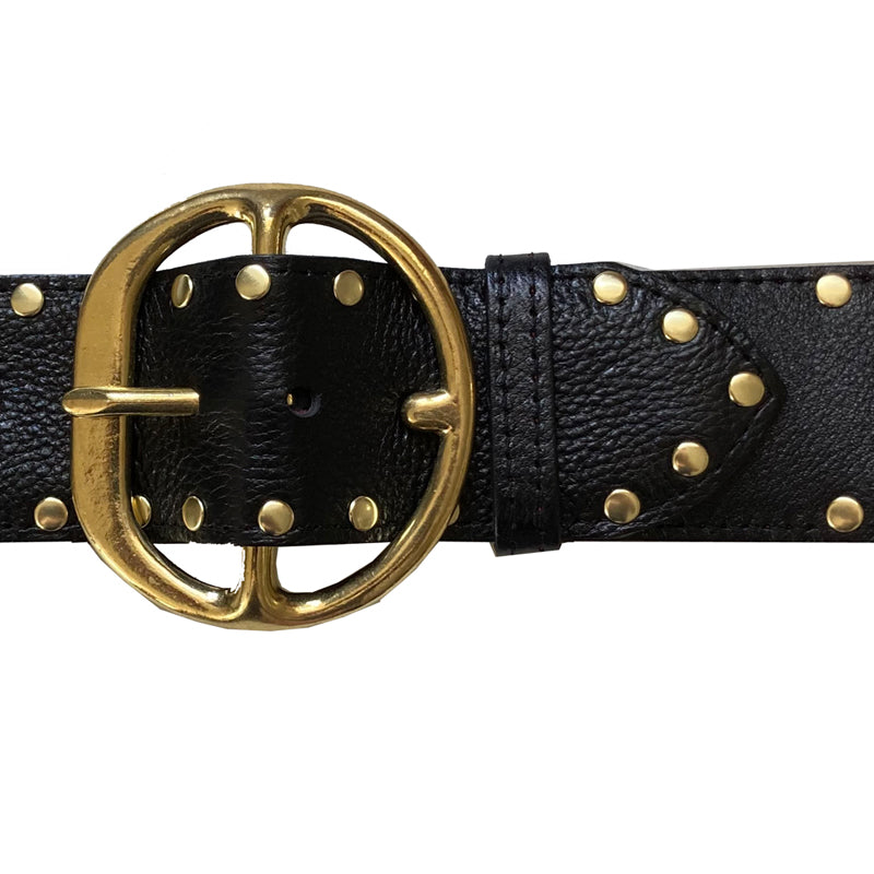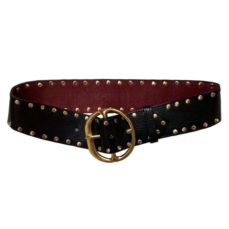 Up the ante in your wardrobe with this amazing studded waist belt! Your little black dress is not so basic when you wrap this around your waist. It's a striking look, and turns whatever outfit you are wearing into instant ultra chic! Wear this big chunky belt over a dress, sweater, blouse, jumpsuit or even your jacket! A great way to cinch in your waist and create an hourglass shape. The leather is a gorgeous dark black with a bit of gloss and texture. Backed in burgundy suede and sewn. The buckle is made of 100% brass. Always made in the USA with impeccable craftsmanship. Regarding sizing: each belt has 5 holes spaced 1" apart, the sizing below is the measurement to the middle hole (allowing for 2" adjustment on either side).