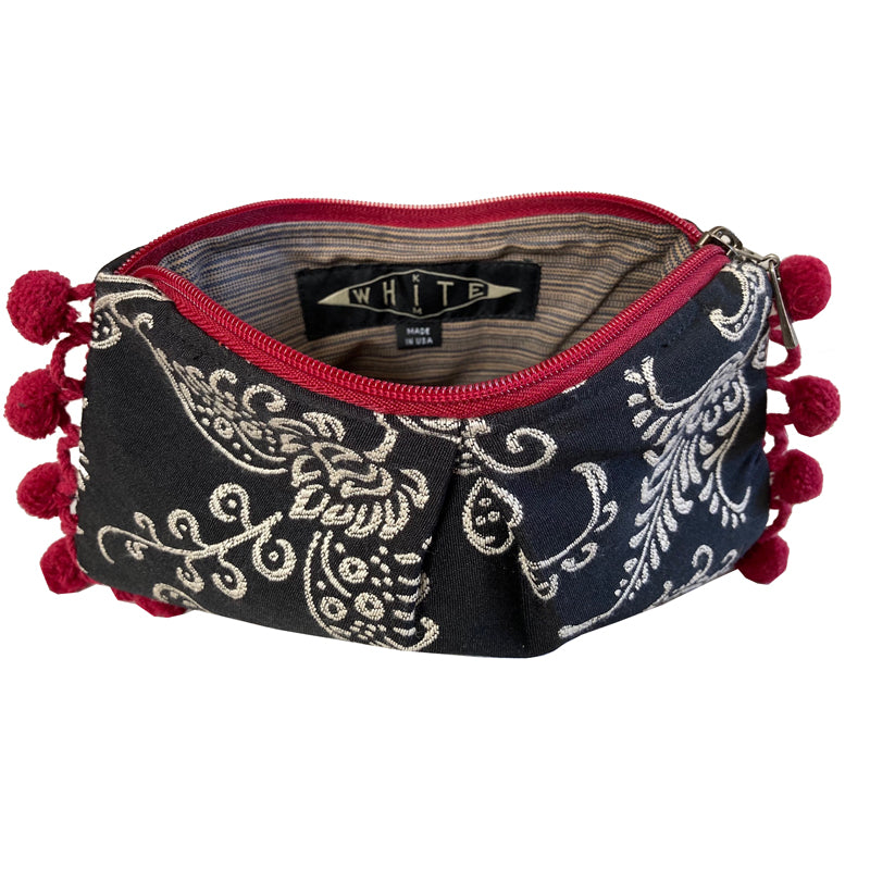Classic black and white, but done in a super cute floral where white embroidered flowers and fronds float on a black ground. Trimmed in burgundy pom poms! The bag has a pleat at the front center, allowing it to expand to hold lots. Such a cute touch, and makes for a fun feminine little something-something to either use as a clutch or a cosmetic bag to put inside your larger bag. Lined in a contrasting fabric, and double-stitched for durability. Zipper top. No leather (vegan friendly). Always made in the USA by real people. Each bag hand cut and hand sewn! Highest quality sewing so this lasts and lasts.