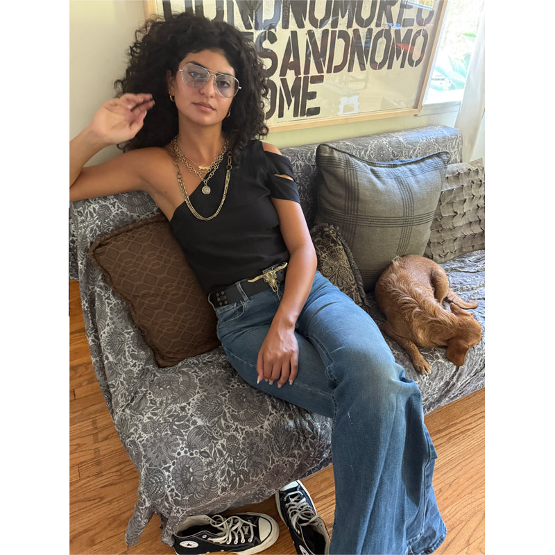 A great novelty belt that is a great conversation piece. Great for parties or generally looking badass! Here we have the classic steer buckle designed with a dark black leather strap that has been pieced and then riveted back together for added design detail. The buckle is antique brass. The belt strap consists of four separate pieces of leather, so when you're walking away...you look cute from the back, too, because the rivet detailing is also in the "back"!! We love this one!! Adjustable. 1-1/2" leather strap. Made with impeccable craftsmanship. Adjustable. Strap is 1-1/2" wide. For both men & women. Regarding sizing: each belt has 5 holes spaced 1" apart, the sizing below is the measurement to the middle hole (allowing for 2" adjustment on either side)