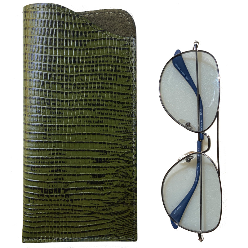 A sophisticated avocado snake print on cow leather, lined in avocado green suede.   The suede lining protects your lenses and the thinness of the case makes this your go-to eyeglass case for small bags, or your pocket!  Made in USA.