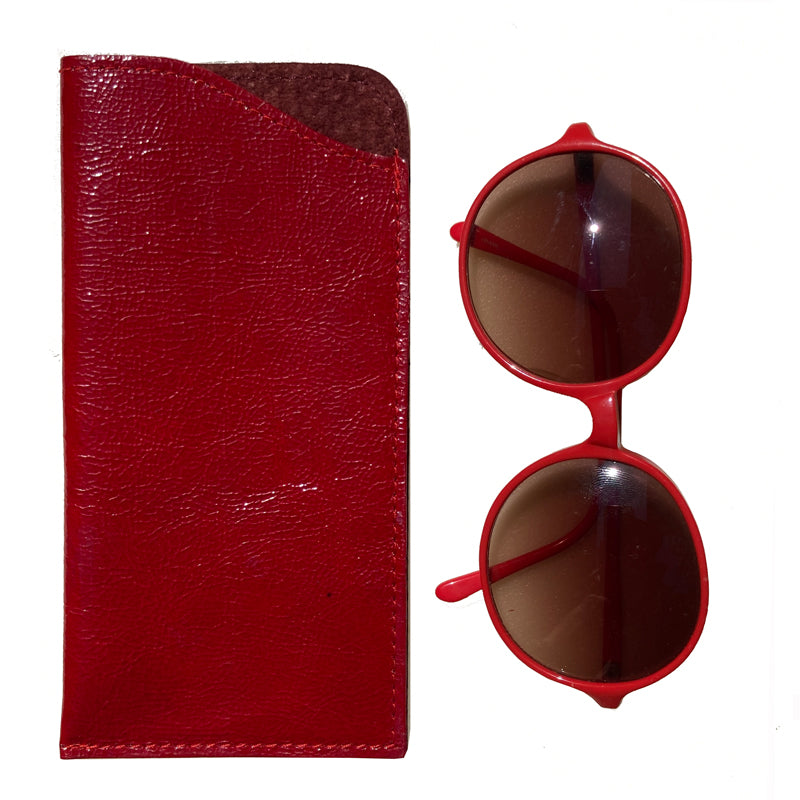 Shown here in a lipstick red patent leather.  A great case that doesn't take up that much room in our bag, and is soft -- not like those hard cases that gobble so much real state in your bag or pocket.   Lined in burgundy suede to protect your glasses.  Made in USA.
