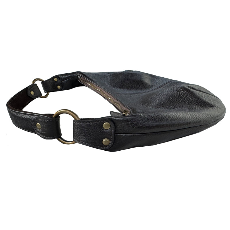 This espresso leather is so dark, it's almost black. A super, duper dark brown with a soft, glossy hand. The leather is gorgeous. The PERFECT hobo bag! It's not too small, and not too big...but just RIGHT! Made with the highest quality leather. Kim added suede under the strap so it doesn't slip off your shoulder. The straps are held to the bag by ornamental tabs with antique brass Orings and rivets. It's just really the cutest! 14" wide x 18" high from top of strap to the bottom of the bag. Impeccable craftsmanship with top metal zipper, canvas lining with inside zipper pocket. Built to last and made in the USA.