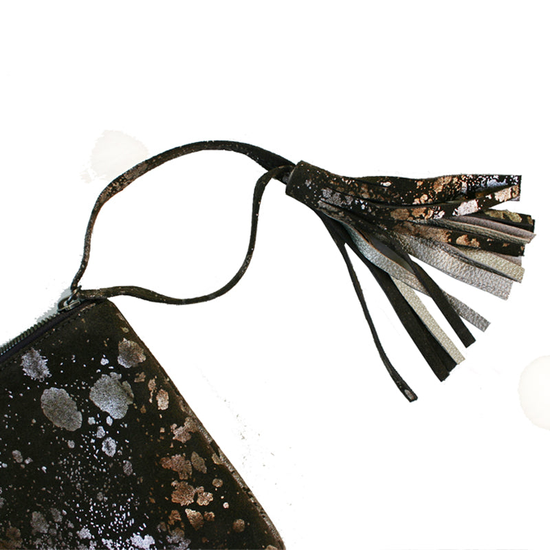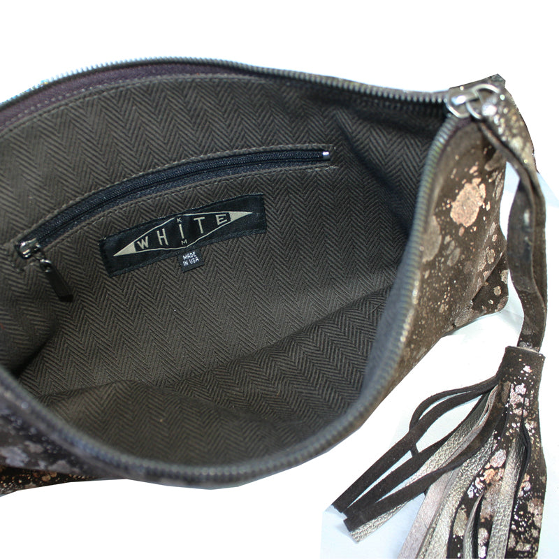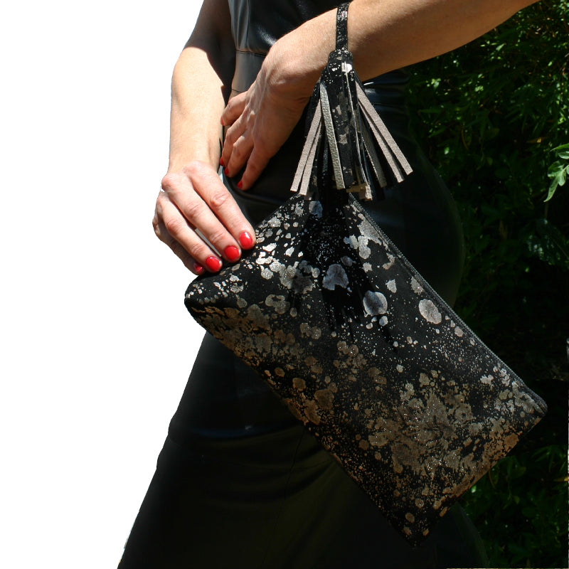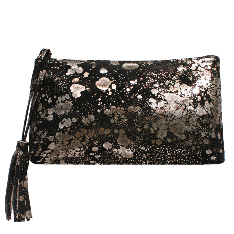 A large clutch in a gorgeous leather that is perfect for an evening out where you need a little "bling" and lots of room for all your stuff! We love this leather. Like someone splattered metallic paint on it. The tassel has a long lead that's large enough to slip your hand in, so you can wear it as a wristlet if necessary. Lined in grey herringbone canvas with an inside zipper pocket. 12" wide x 7.5" high. Made in USA. Free shipping!