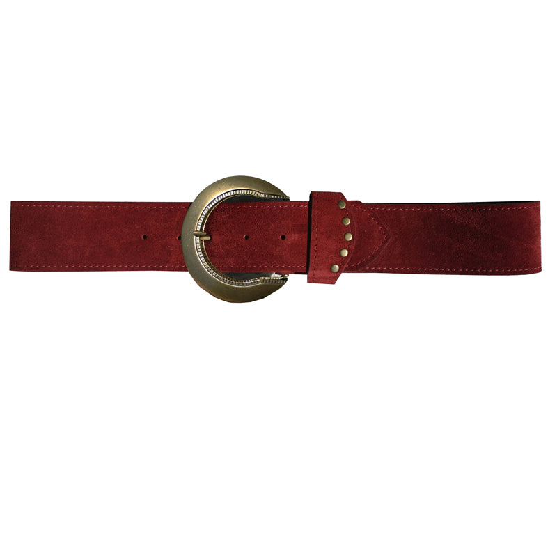 Burgundy with antique brass is such a pretty combination. And burgundy is nice substitute for black. Pair it with a black dress or sweater, and it's a great look! This unique large circular buckle has a subtle design detail in the recessed or "stepped" area that's just a tiny register of etched lines. So cute! The decorative keeper is embellished with rivets for added panache. The suede belt is backed in leather and sewn. Regarding sizing: each belt has 5 holes spaced 1" apart, the sizing below is the measurement to the middle hole (allowing for 2" adjustment on either side)