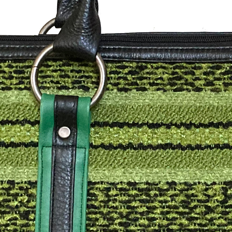 SUCH an amazing vintage textile! Registers of different widths of shades of green accented with black. The fabric is a thick boucle' with a nubby-type texture. This mint condition textile was originally intended for furniture from the 60s/70s era. Can you imagine the couch?! Ha! Kim has been collecting vintage textiles for years, and this is one of the stand outs! Look amazing as you walk into your hotel, or onto your plane! This bag fits under the seat in front of you on planes, as well as the overhead of course. It's trimmed in a dark black leather, with kelly green leather trim accenting the front. So cute! It comes with a detachable shoulder strap, is lined in a sturdy black canvas with an inside zipper pocket and an organizer pocket. Leather bottom has metal feet. Always made with impeccable craftsmanship, handmade one by one in the USA. 24" wide x 15.5" high with a 9" gusset. Free shipping in the USA! Tax added at checkout if purchased in California. MORE COLORS TO BE ADDED TO THE SITE SOON!