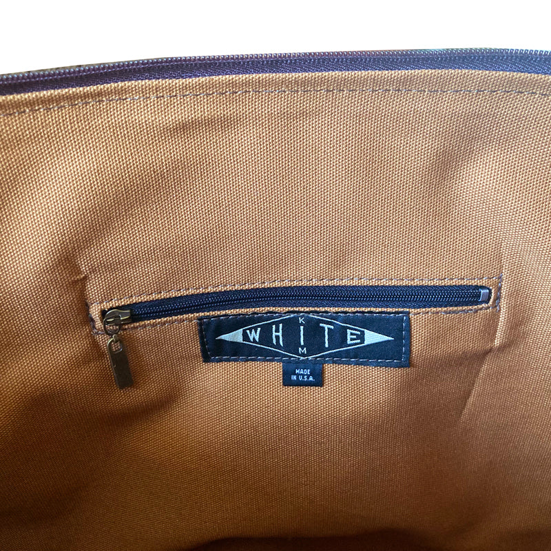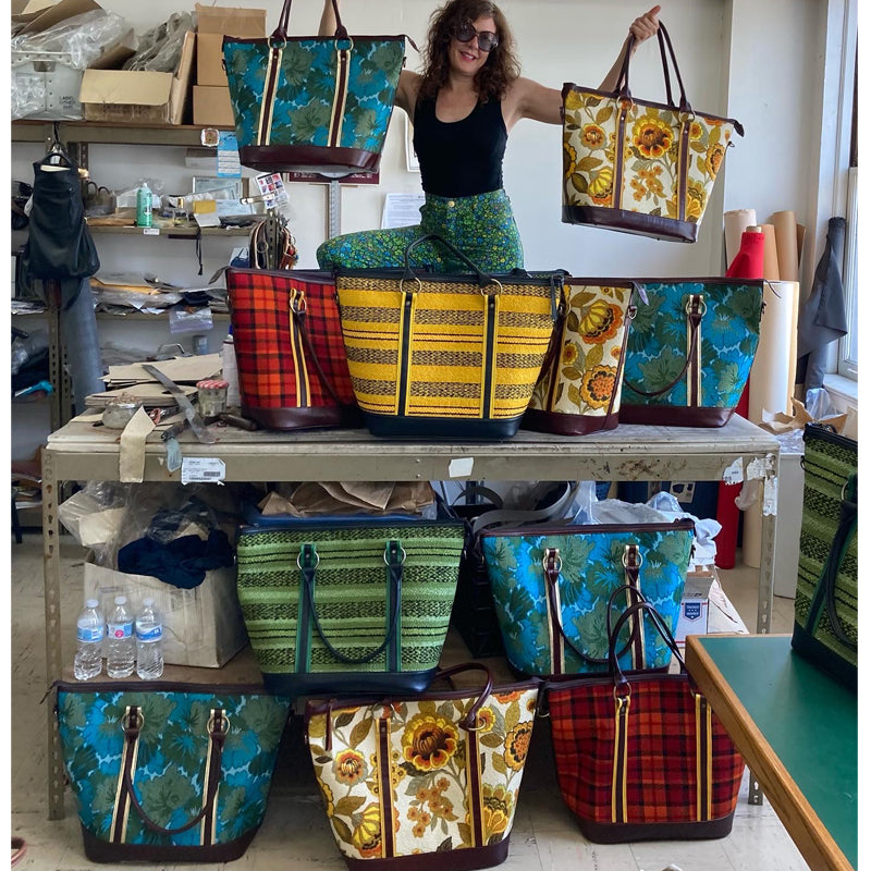The Weekender is TO DIE FOR! This vintage floral textile is beyond adorable! Big, giant yellow blooms literally cover the bag, with cute smaller flowers and leaves filling up the off-white ground. Accented in colors of bright orange, ocher, grayish blue, olive and dark brown. This mint condition textile was originally intended for furniture from the 60s/70s era. Can you imagine the couch?! Ha! Kim has been collecting vintage textiles for years, and this is one of the stand outs! Look amazing as you walk into your hotel, or onto your plane! This bag fits under the seat in front of you on planes, as well as the overhead of course. It's trimmed in high-quality warm brown leather, with yellow leather trim accenting the front. So cute! It comes with a detachable shoulder strap, is lined in a sturdy brown canvas with an inside zipper pocket and an organizer pocket. Leather bottom has metal feet. Always made with impeccable craftsmanship, handmade one by one in the USA. 24" wide x 15.5" high with a 9" gusset. Free shipping in the USA! Tax added at checkout if purchased in California. MORE COLORS TO BE ADDED TO THE SITE SOON!